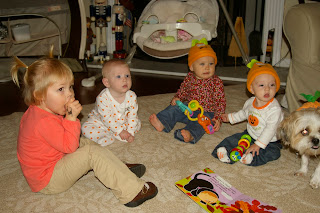 On Halloween Eve, Katie Estle and Katie Howell, brought their girls over for a Halloween playdate. We've been talking about and looking forward to getting pictures of them in their costumes since they were born. Picture sessions are a little bit harder now that they are able to move around, it was a lot easier when we just laid them down and they stayed where we put them! They were all so cute in their costumes and did a great job of putting up with all the picture taking! We were lucky to have Abbie there to help out! It was a fun way to celebrate their 1st Halloweens.